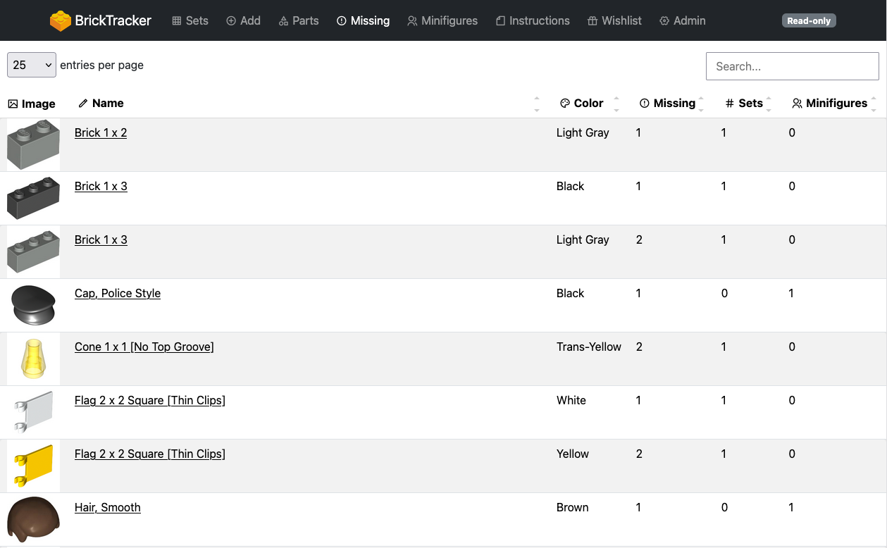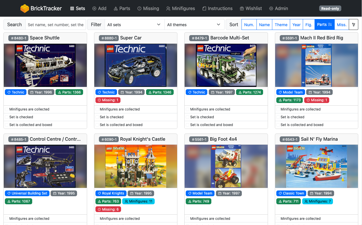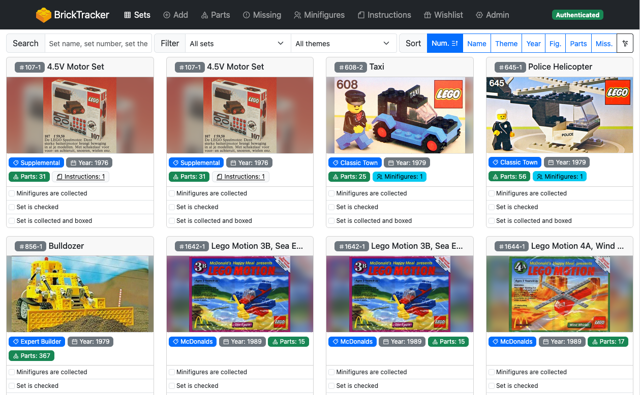 Displays all your sets, with quick look at theme, year, parts, missing parts, minifigures count and status. You can search, filter and sort the grid. The sort order will be stored in a cookie and re-use on next page load.