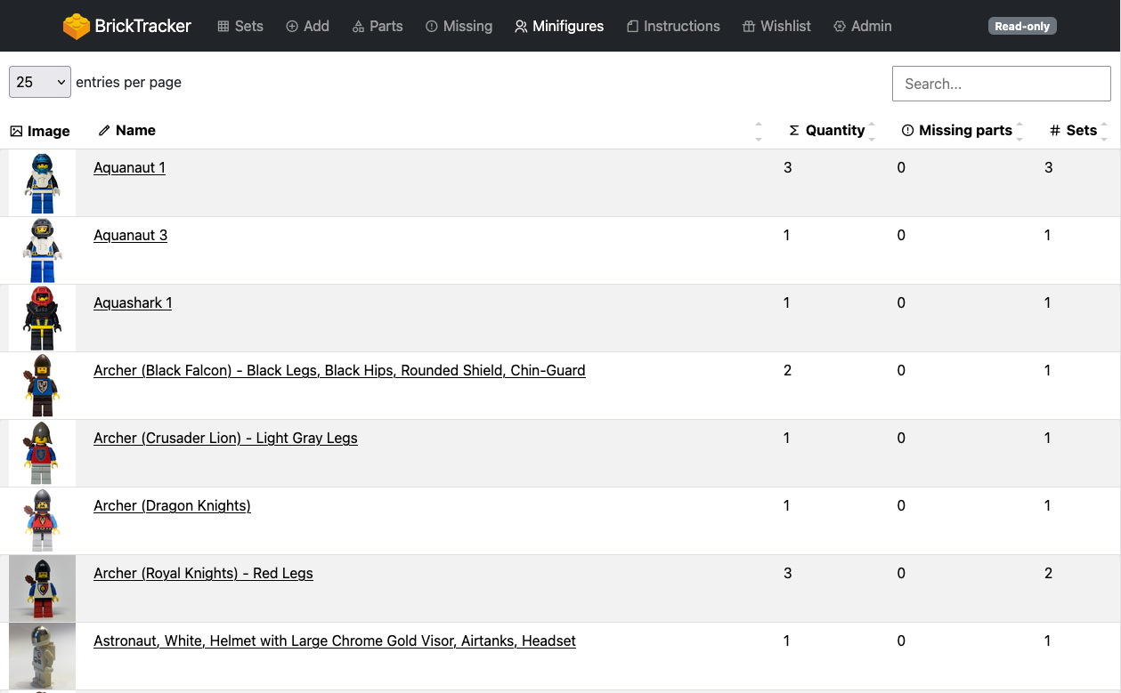 Lists all your minifigures with details on quantity missing, number of missing parts, number of sets using it. You can sort columns, and search the table.
