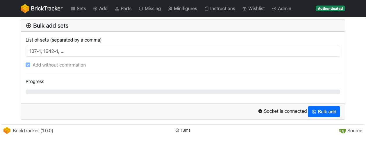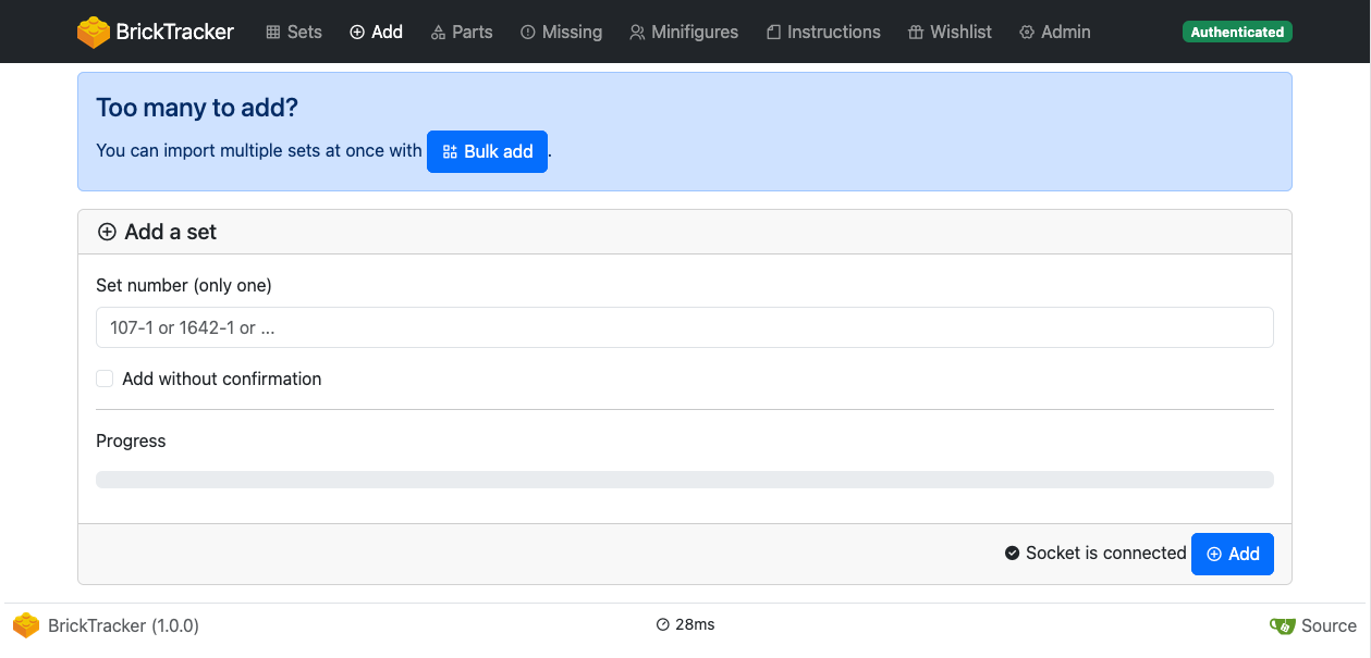 If you need to add many sets at once, you can use the bulk add tool. Instead of a set number, it takes a comma separated list of set numbers. It will then process each number of the list sequentially as if you were doing it yourself one by one. If an error occur, it will put back in the input field the list of number that were not processed.