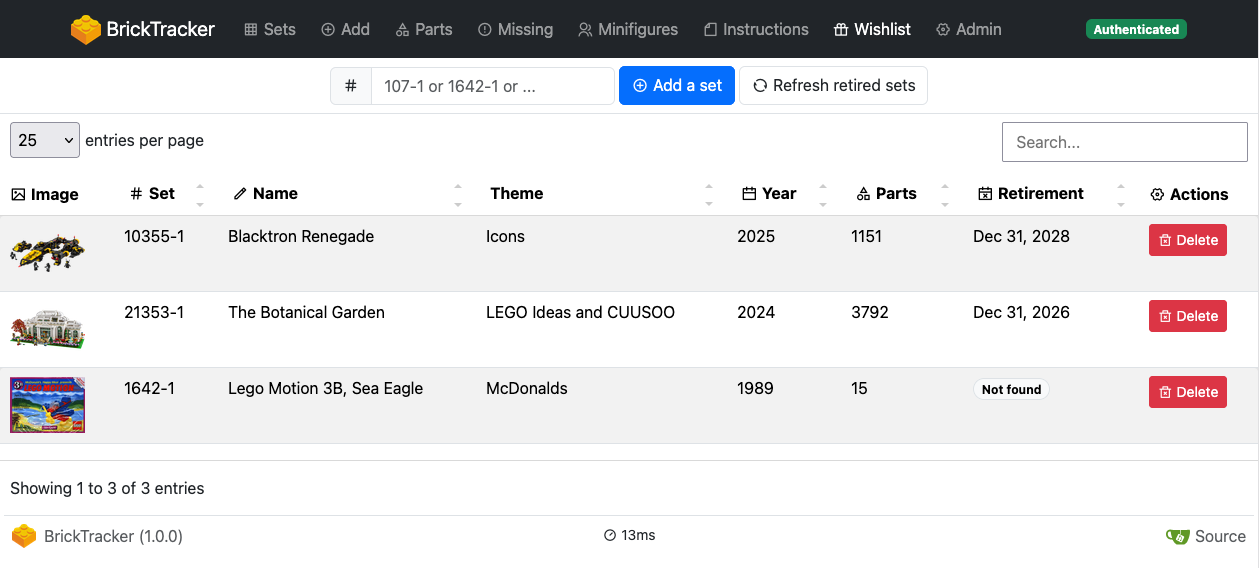Lists all your wished with details on theme, year, parts and unofficial retirement date. If you are authenticated, you can add new wished sets or delete existing ones. You can sort columns, and search the table.