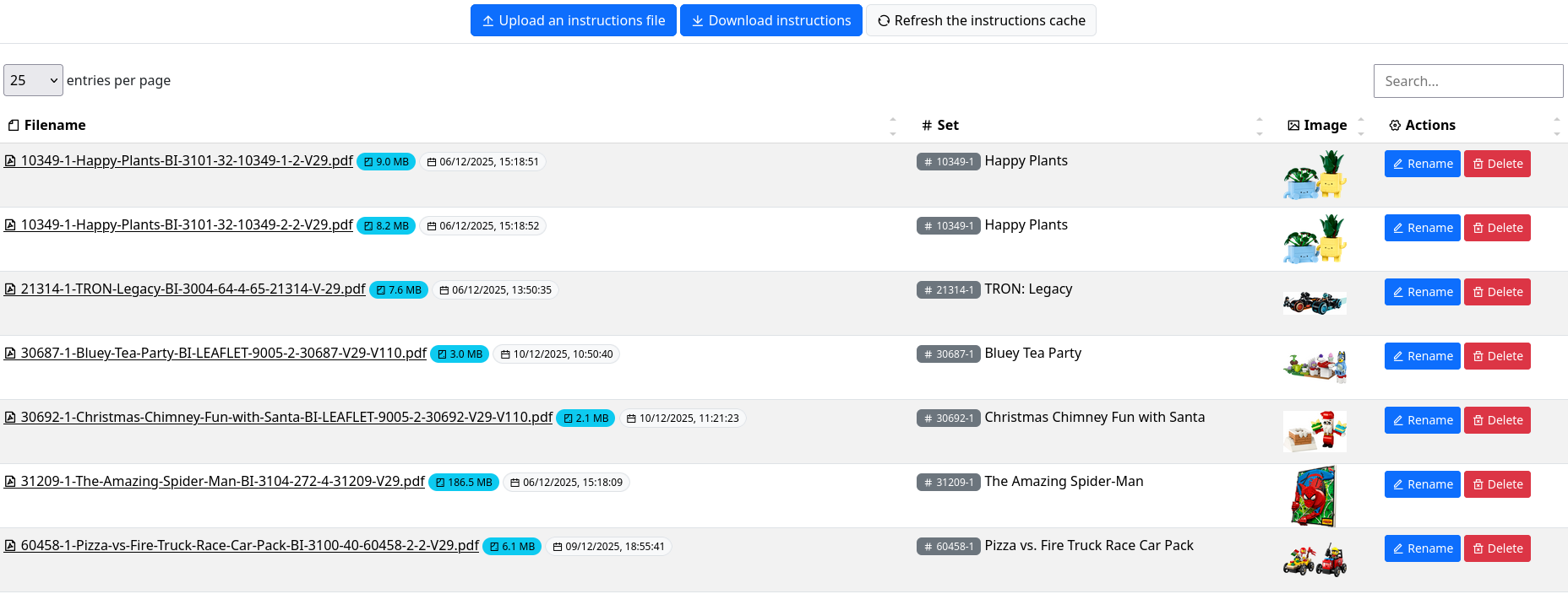 Lists all your instructions and if they are matching a existing set, will display its name and image. If you are authenticated, you can upload new instruction files, rename existing ones or delete them. You can sort columns, and search the table.