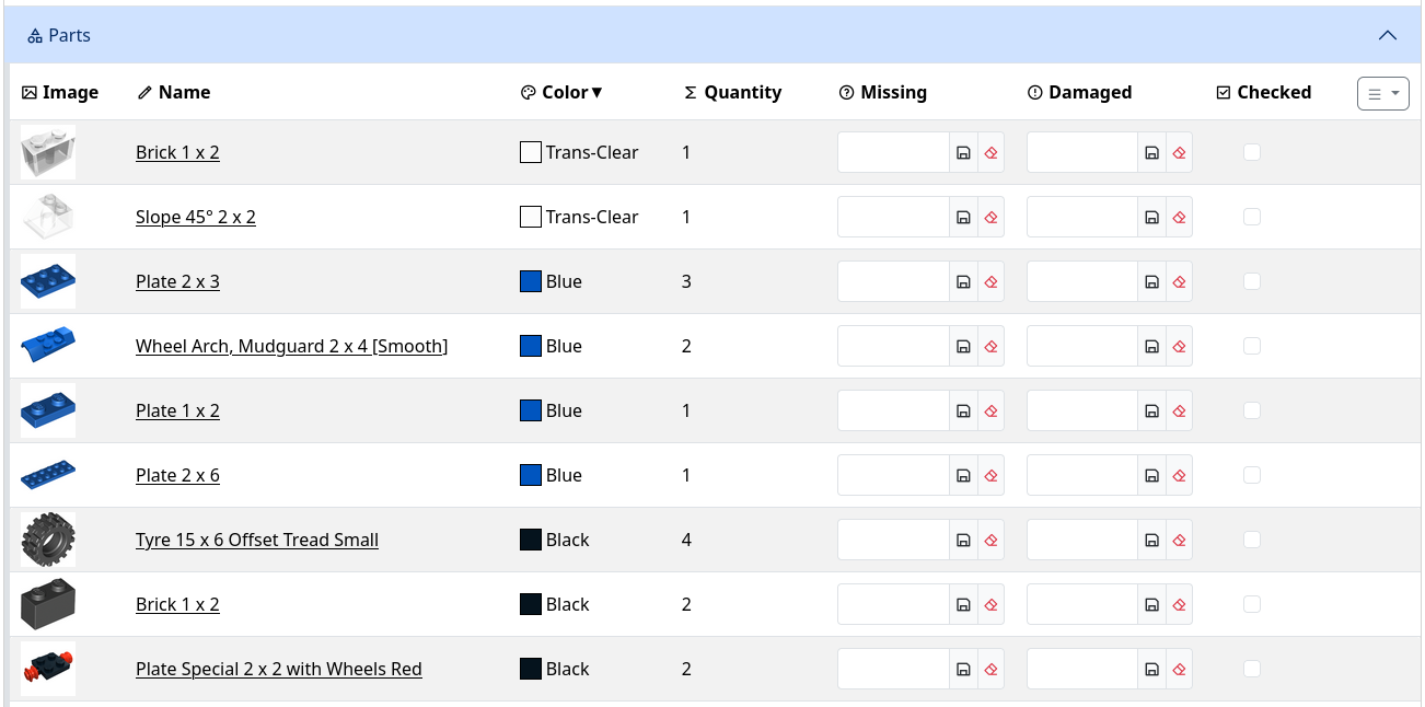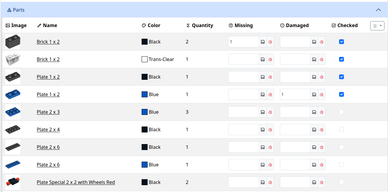 When displaying a set, you can see the list of parts making the set. For each part, you can mark how many of those pieces are missing and/or damaged. As soon as you leave the field it will be immediately saved to the database. A little status mark tells you if the operation was successful.