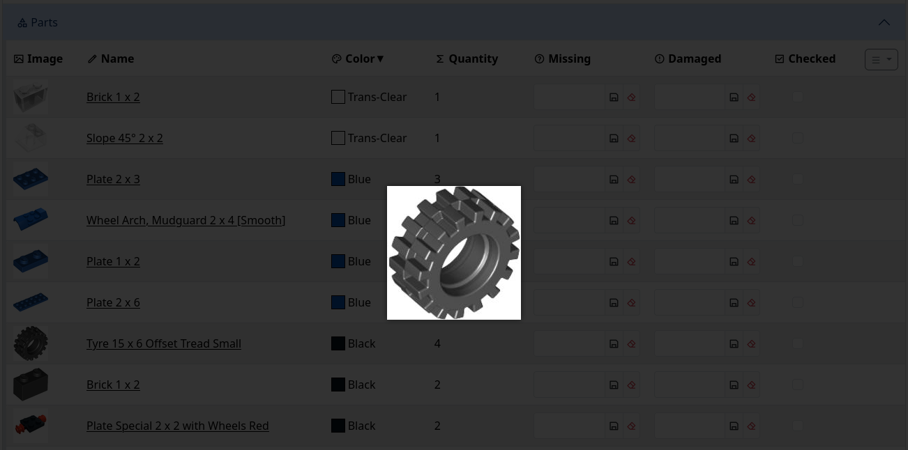 It is also possible to check off a part, if you are doing an audit or trying to find all parts for a set. This info is also saved in the database and persists through sessions.